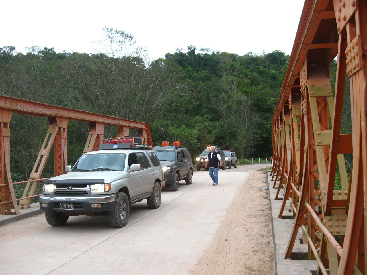 Luego de una paqueta cena y un descanso en línea con las instalaciones, arrancamos muy temprano para el norte, con la intención de cruzar a Bolivia por el paso Bermejo, bueno en este punto la burocracia latinoamericana no se hizo esperar y un par de chatas del equipo debió muñirse vía mail y locutorio mediante de una constancia que decía que su seguro tenía cobertura en Bolivia a pesar de decir en la póliza que los países limítrofes estaban dentro del marco de dicha cobertura. Resuelto el inconveniente y habiendo perdido unas 3 hs seguimos hacia el norte por territorio Boliviano Ruta 1 siempre por un atractivo paisaje que va pegado al Rio Bermejo. Poco antes de “La Mamora” tomamos hacia nuestra izquierda y cruzamos ya sin aduana por un importante y colorido puente (nótese en las fotos ambas banderas pintadas en el) que nos metiera otra vez a territorio Argentino.
