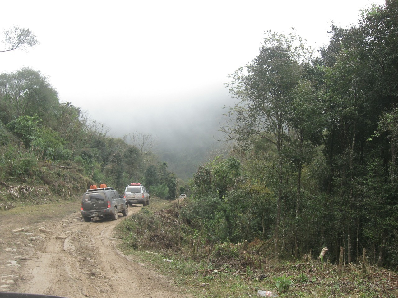 El nuevo objetivo era el Parque nacional Baritú el cual está en nuestro territorio pero solo se puede ingresar vía Bolivia (por lo menos legal y oficialmente, vamos a ver que dice Eduardo de viajeros cuando termine su relato el cual vengo siguiendo con mucha expectativa). Las demoras de aduana y la copiosa lluvia complicaron nuestro día dentro de un camino que arranco con ripio y termino con un patinoso y peligroso barro que quería llevar indefectiblemente nuestras chatas y porque no nuestras vidas hacia el frondoso e interminable precipicio. Dentro de ese marco, donde la aventura y la cordura pelea dentro de nuestras cabezas y haciendo números de km y promedios decidimos seguir subiendo hasta cierta hora y poder recorrer la parte más peligrosa del camino con algo de luz del día. Así fue que pudimos llegar a la entrada al parque, pero no entrar al mismo, otra opción era dormir dentro del parque donde había cabañas pero muy pocas y muy caras, y donde para llegar allí había una nenita que nos indicaba que el río estaba crecido y nuestras camionetas serían "chupadas" al intentar vadearlo. Teniendo en cuenta lo consensuado con el grupo y una cadena de reservas de hoteles ya cerradas emprendimos regreso para llegar a Tarija y comer asado argentino en una recomendable parrilla.